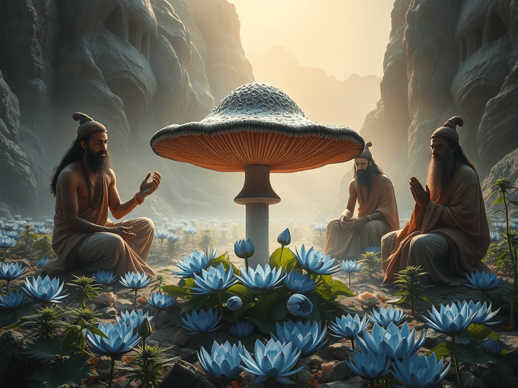 Les descriptions du Soma dans les textes anciens parlent d’une plante sans feuille, sans fleur, sans fruit, et sans graine. On y trouve le mot amshu, qui signifie filament ou fibre. Tous ces éléments laissent penser qu’il ne s’agissait pas d’une plante classique, mais plutôt d’un champignon, probablement un psilocybe. Ce champignon contient des substances proches de celles que notre cerveau produit dans les états modifiés de conscience.